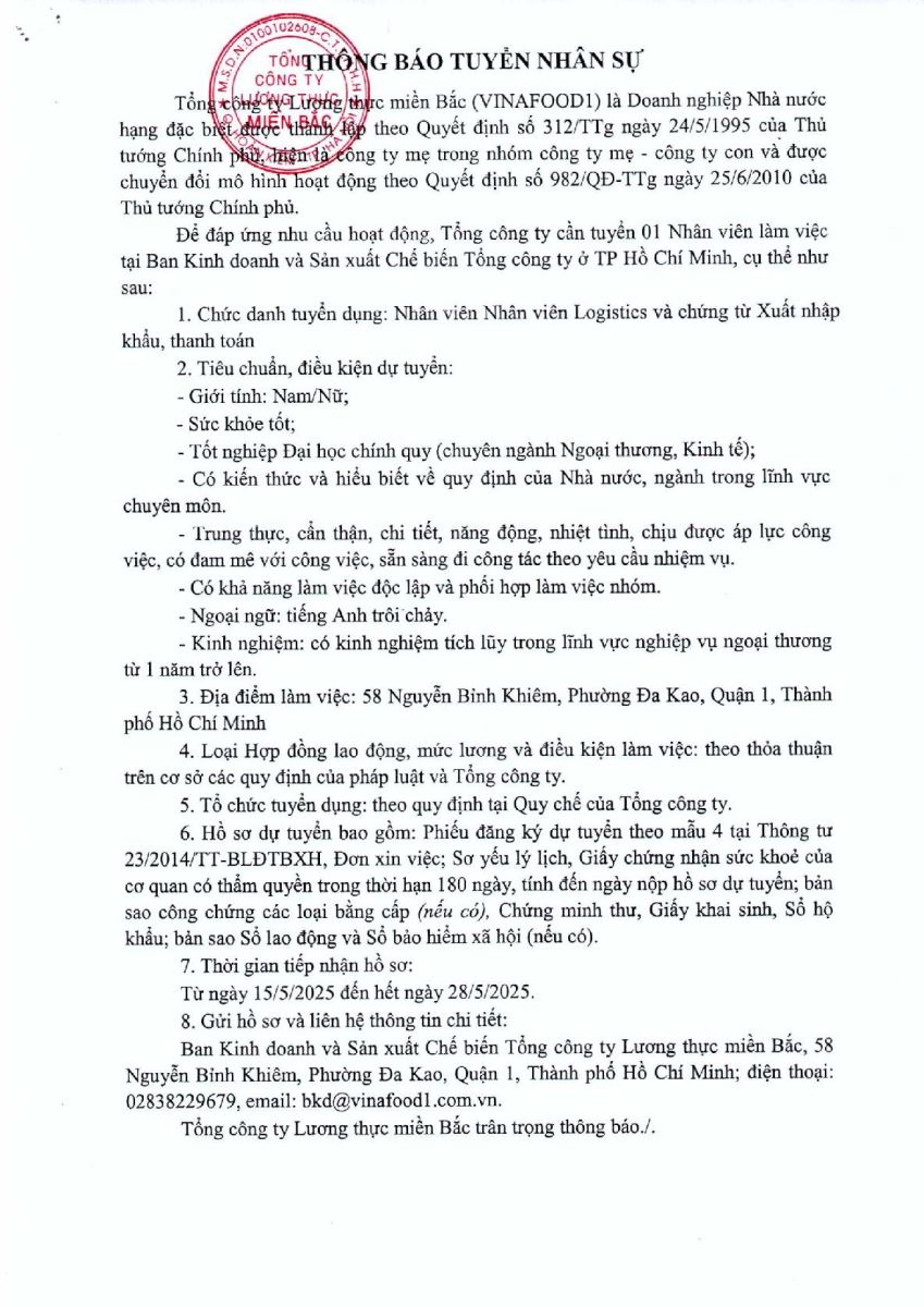 TCTLTMB: Thông báo tuyển nhân sự tại Ban Kinh doanh sản xuất và Chế biến Tổng công ty ở TP Hồ Chí Minh