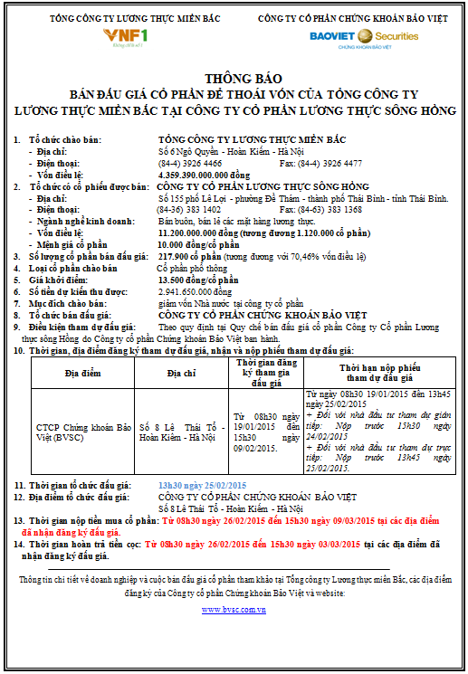 1. Thông báo bán đấu giá cổ phần Công ty CP lương thực Sông Hồng