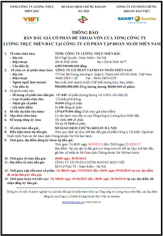 Thông báo bán đấu giá cổ phần Công ty CP Tập đoàn Muối Miền Nam