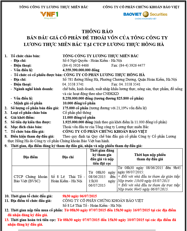 Thông báo bán đấu giá cổ phần tại Công ty Cổ phần Lương thực Hồng Hà