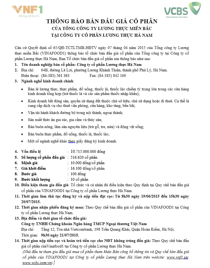 Thông báo đấu giá cổ phần của Tổng Công ty Lương thực miền Bắc tại Công ty Cổ phần Lương thực Hà Nam