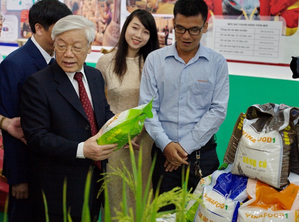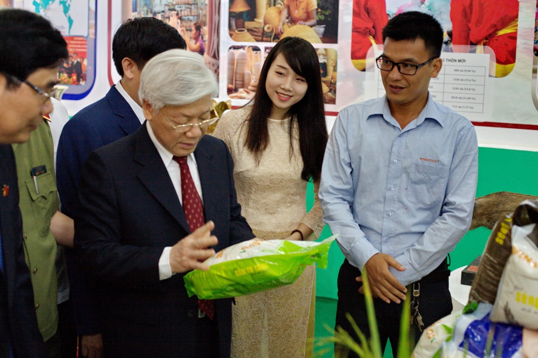Tổng bí thư Nguyễn Phú Trọng thăm gian hàng trưng bày sản phẩm gạo thương hiệu của Tổng công ty Lương thực miền Bắc tại Triển lãm 70 năm thành tựu Kinh tế - Xã hội