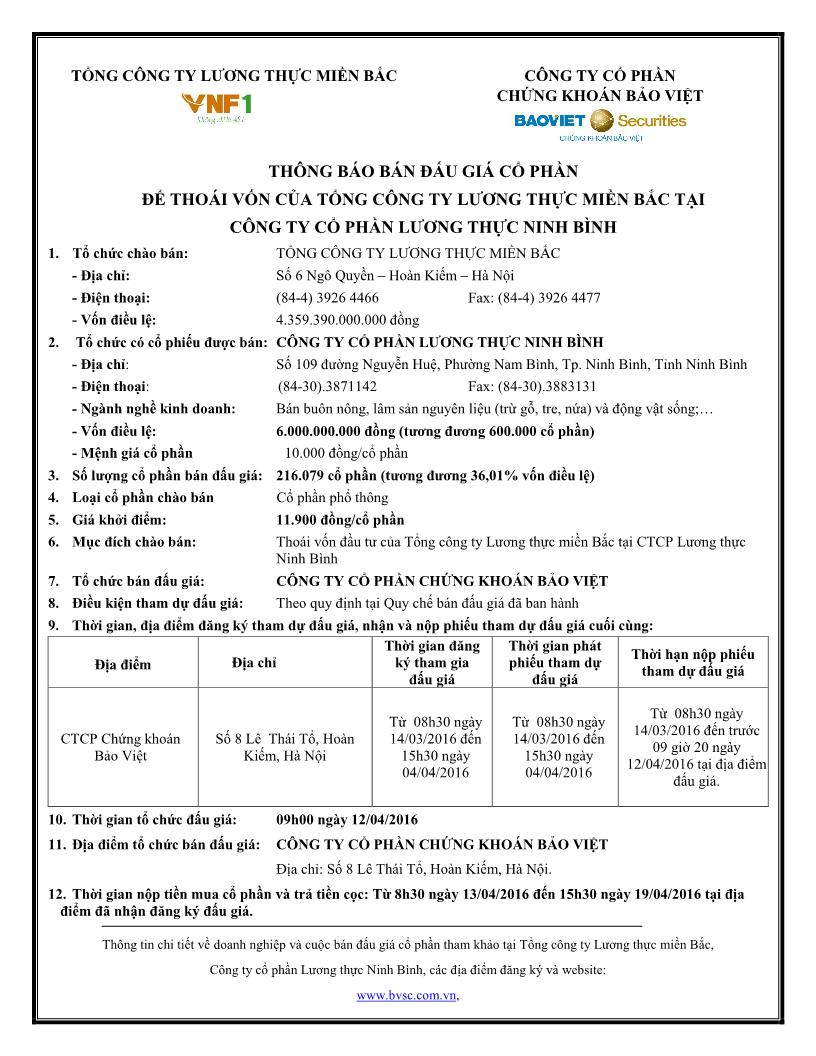 THÔNG BÁO BÁN ĐẤU GIÁ CỔ PHẦN TẠI CÔNG TY CỔ PHẦN LƯƠNG THỰC NINH BÌNH