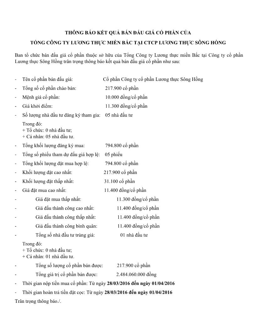 THÔNG BÁO KẾT QUẢ BÁN ĐẤU GIÁ CỔ PHẦN CỦA TỔNG CÔNG TY LƯƠNG THỰC MIỀN BẮC TẠI CTCP LƯƠNG THỰC SÔNG HỒNG