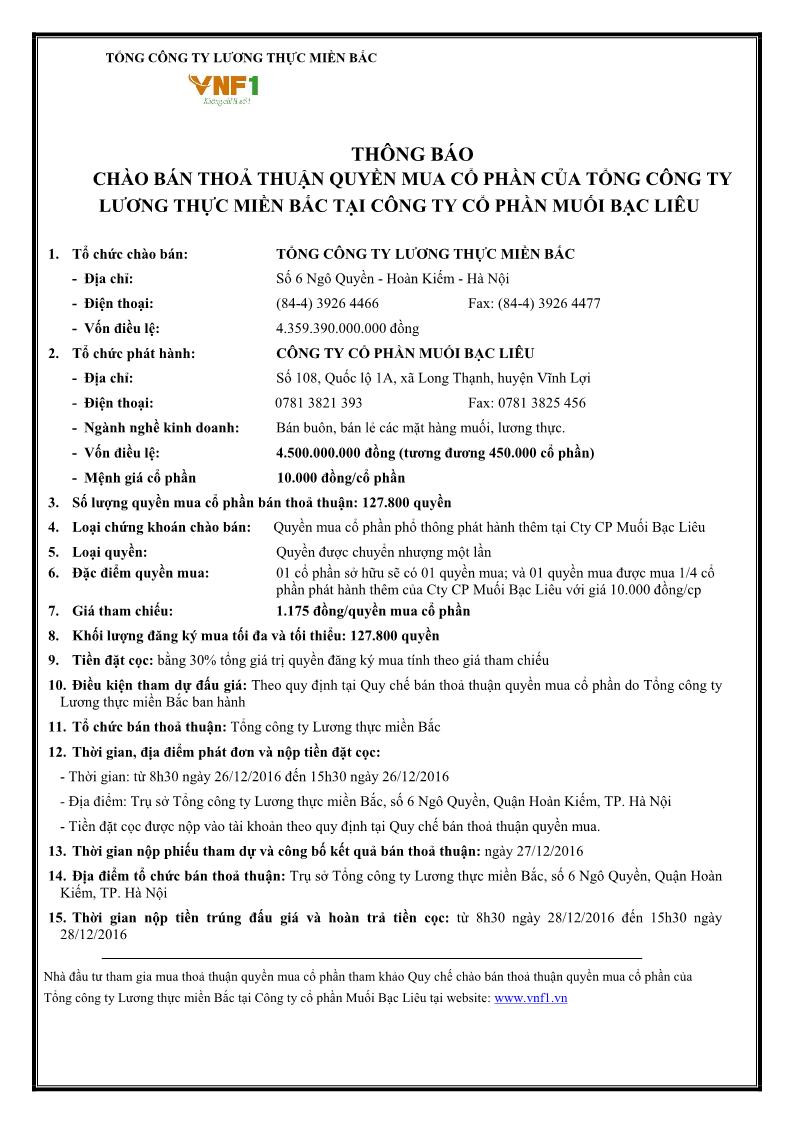 THÔNG BÁO CHÀO BÁN THOẢ THUẬN QUYỀN MUA CỔ PHẦN CỦA TỔNG CÔNG TY LƯƠNG THỰC MIỀN BẮC TẠI CÔNG TY CỔ PHẦN MUỐI BẠC LIÊU