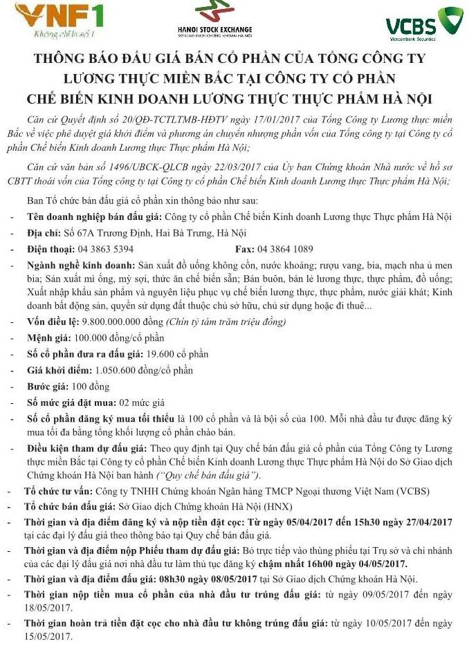 Thông báo đấu giá bán cổ phần của Công ty Cổ phần Chế biến Kinh doanh Lương thực Thực phẩm Hà Nội do Tổng Công ty Lương thực miền Bắc sở hữu