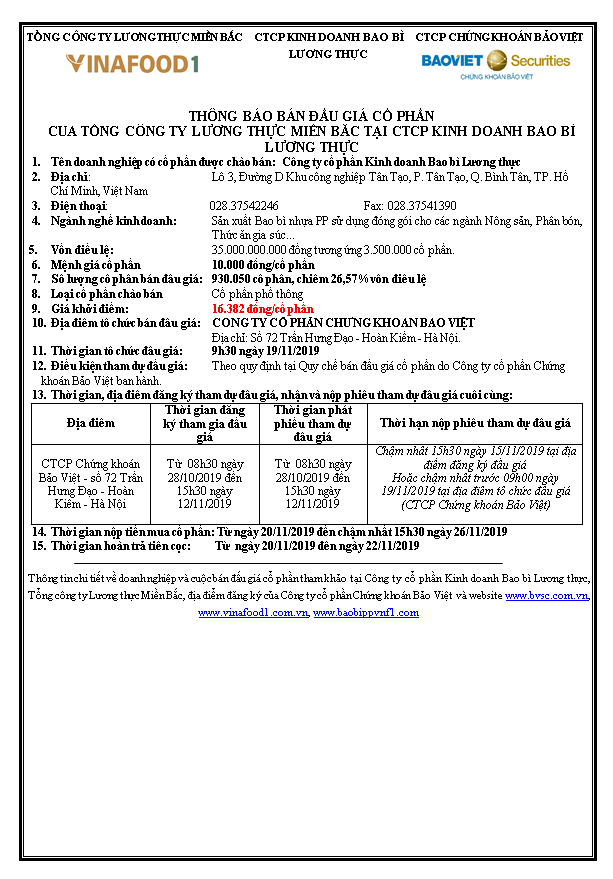 TCTLTMB: THÔNG BÁO BÁN ĐẤU GIÁ CỔ PHẦN CỦA TỔNG CÔNG TY LƯƠNG THỰC MIỀN BẮC TẠI CTCP KINH DOANH BAO BÌ LƯƠNG THỰC