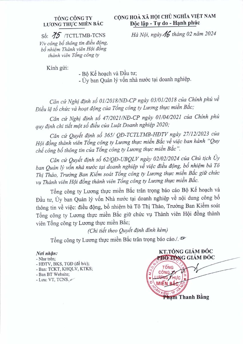 TCTLTMB: Công văn số 75/TCTLTMB-TCNS ngày 16/02/2024 V/v công bố thông tin điều động, bổ nhiệm Thành viên Hội đồng thành viên Tổng công ty - Tô Thị Thảo