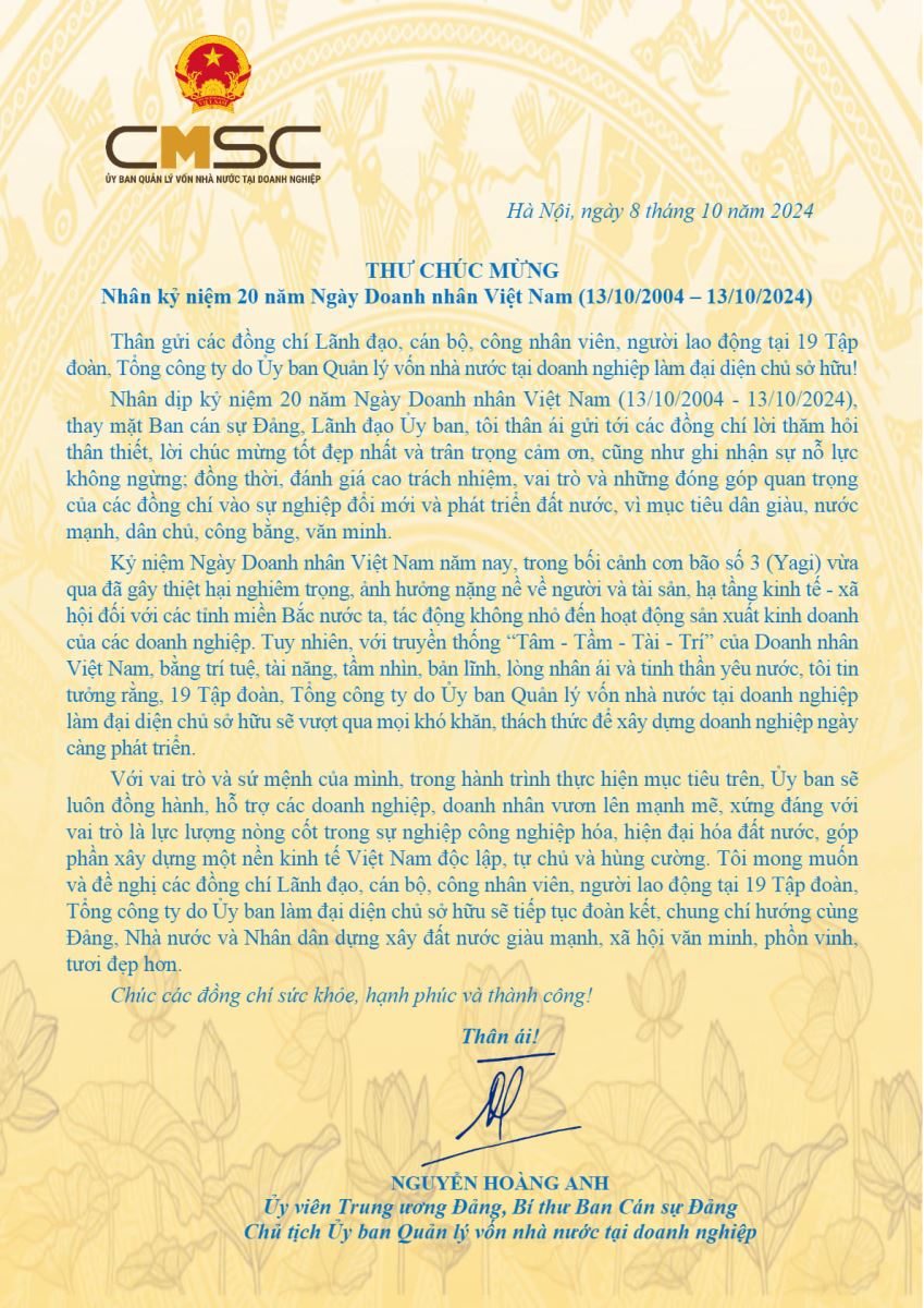 Thư chúc mừng nhân kỷ niệm 20 năm ngày Doanh nhân Việt Nam (13/10/2004 - 13/10/2024)